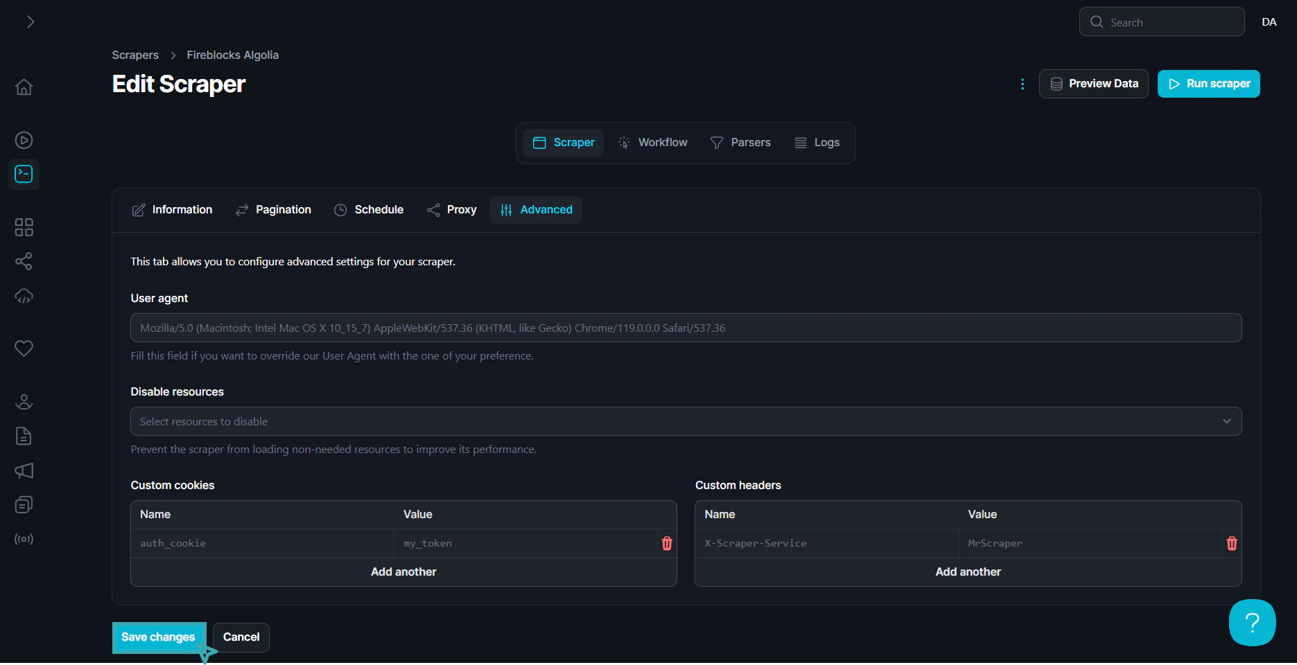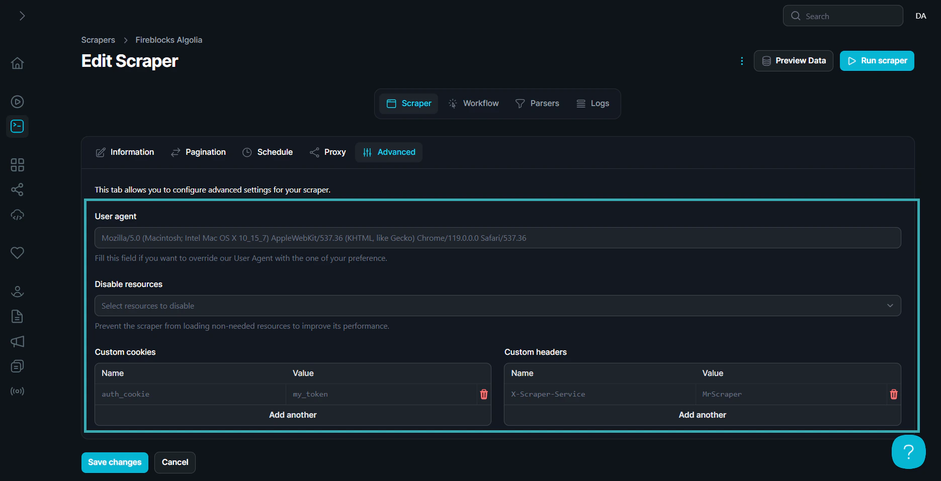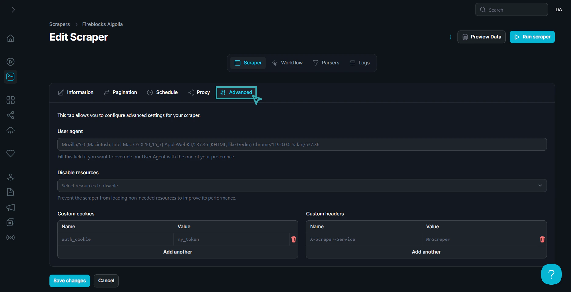 The Advanced tab offers additional options for configuring your web scraping tasks, including setting custom user agents, cookies, headers, and resource restrictions to optimize the scraper’s performance and behavior.Use the Advanced Features