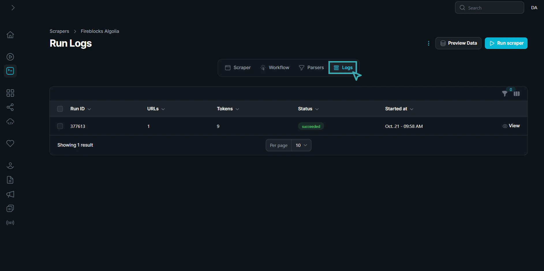 To view the run logs, simply click on the Logs tab in the main navigation. This will display a comprehensive list of all scraper run logs, providing insights into the execution history of each scraper.
